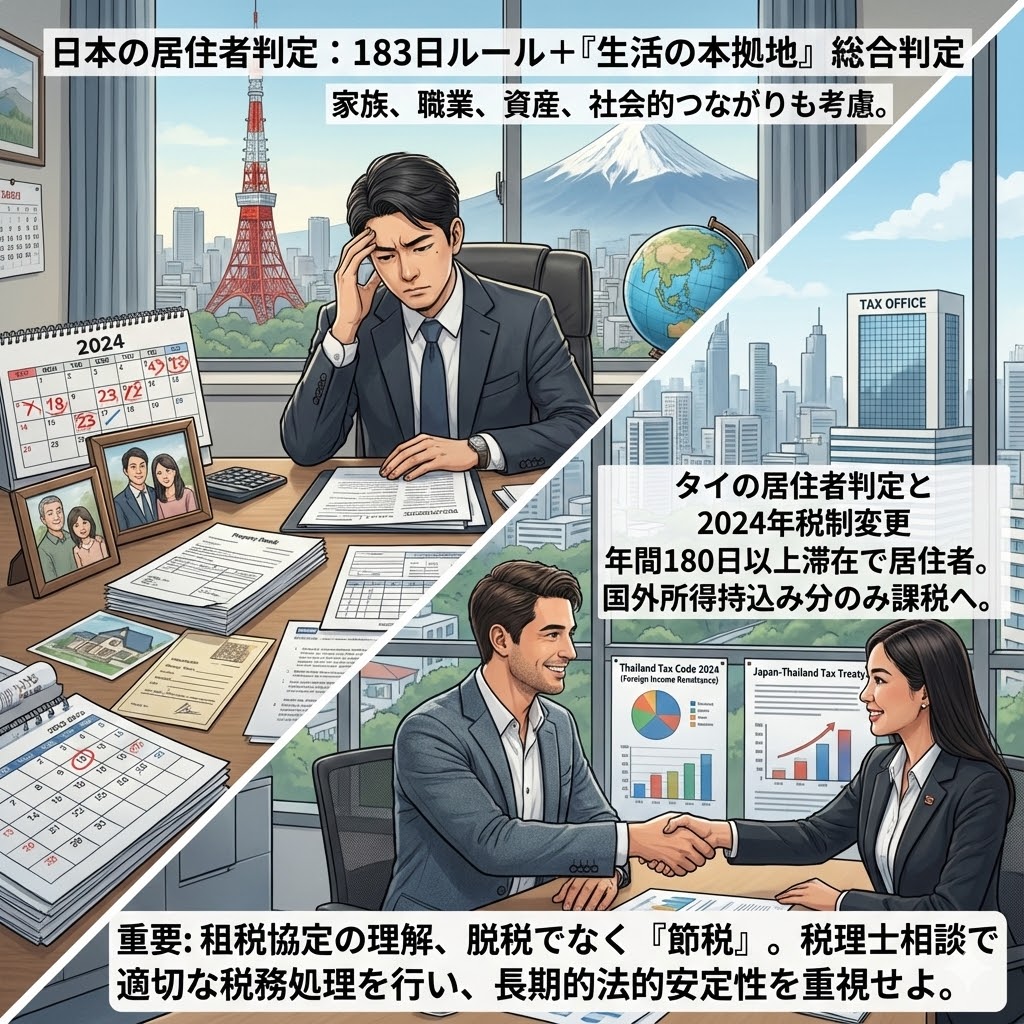 日本の場合、183日ルールに加えて「生活の本拠地がどこにあるか」という総合判定が行われる。