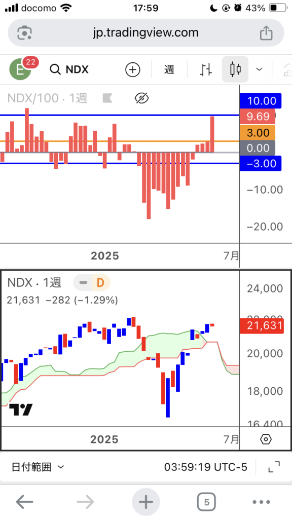 下の図はナスダック指数の動きと私が信頼しているSKEW指数のヒストグラム(棒グラフ)の動きだ。