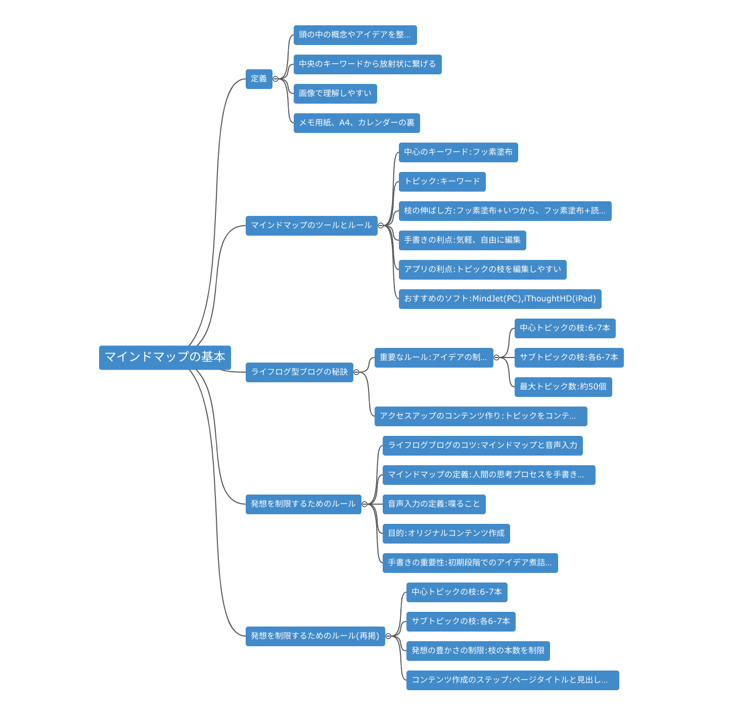 私が使っているルールは、(1)中心トピックからの枝は6~7本 (2)サブトピックからの枝も各々6~7本というものだ。