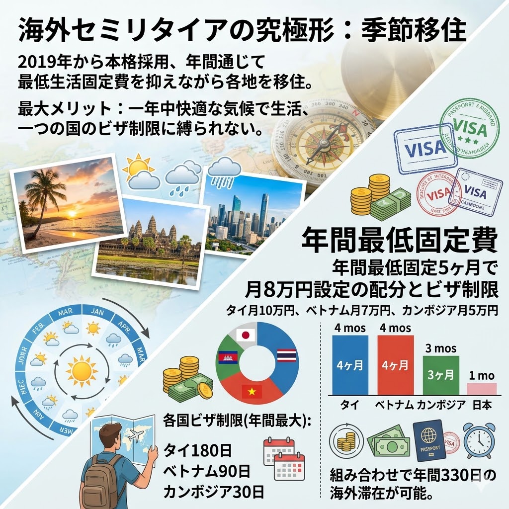 特に東南アジアでのリラックスした生活を中心に据えながら、日本の夏を避けてタイ、雨季を避けてベトナム、乾季にカンボジアといったローテーションを組むことで、常に最適な環境で過ごすことが可能になった。