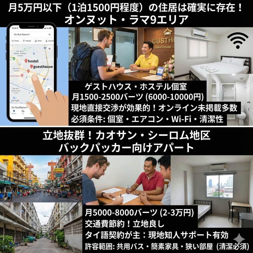 カオサン周辺やシーロム地区には、月5000-8000バーツ(2-3万円)程度の個室アパートが多数存在する。